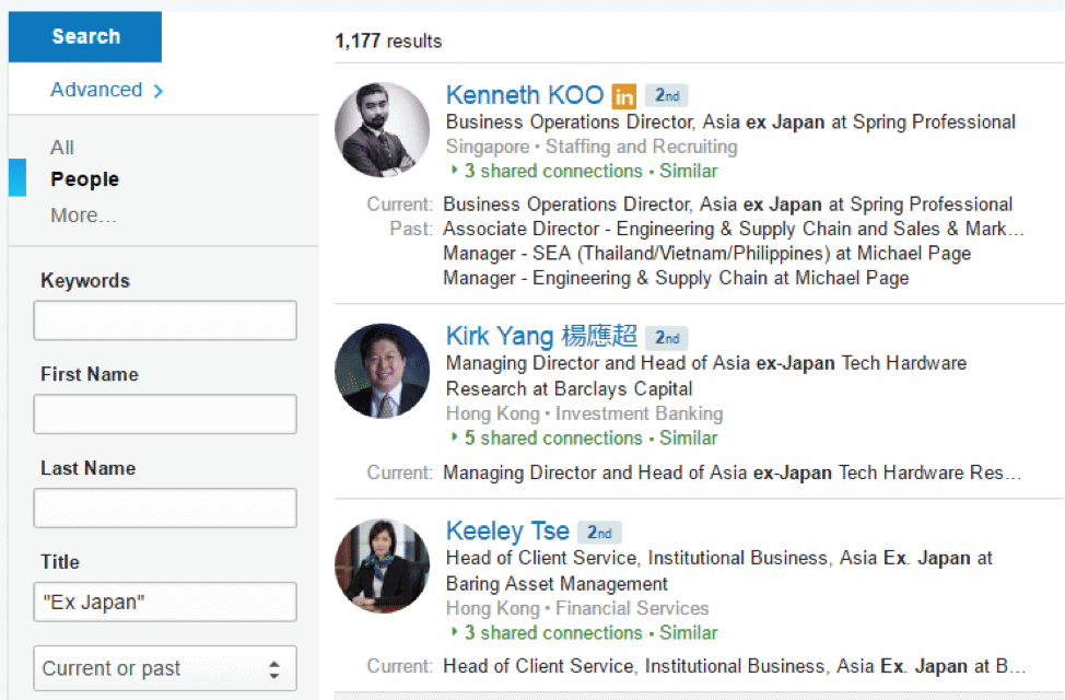 A given industry’s inclination to exclude Japan can be easily discovered through a professional networking database such as LinkedIn. A keyword search of the site reveals, for example, that not only do 90 LinkedIn members use the phrase “Non‐Japan Asia” in their job title (present or past), but that all of them have worked for investment banks such as Credit Suisse and Morgan Stanley, which started using such titles in the mid‐1990s.